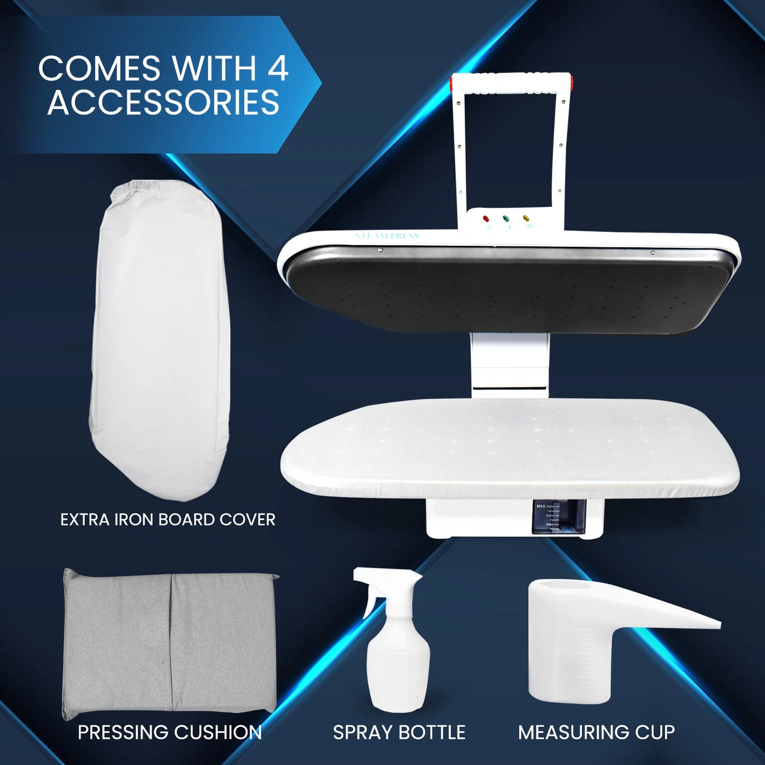 Included in this iron steamer press set is an extra iron board cover, replacement underfelt foam, spray bottle, pressing cushion, and a water filler cup to equip you with everything you need for a more pleasant ironing routine.